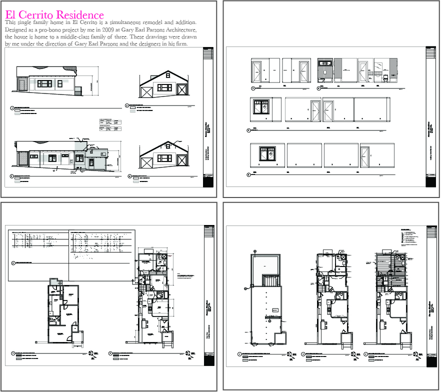 This El Cerrito residential addition and remodel was designed by me in 2010 and build over the next year. Now complete, the house is home to a working-class family. The project was a turning point in my career: having become a real, practicing architectural professional, I realized both the importance of design in the lives of everyday people and the fact that much of the architectural discipline was becoming less and less accessible to the average wage-earner. As deeply gratifying as this project was, it was also troubling: had my architecture firm not been doing this family a favor by doing the project pro-bono, they could never have afforded our services. And had the client not been a contractor, and built the designed project himself, the construction itself would have been too costly for the combined salaries of a contractor and a schoolteacher. Technically speaking, it was highly educational to see a project through from drawing-board to completion, and I learned a lot from drafting the below drawings.